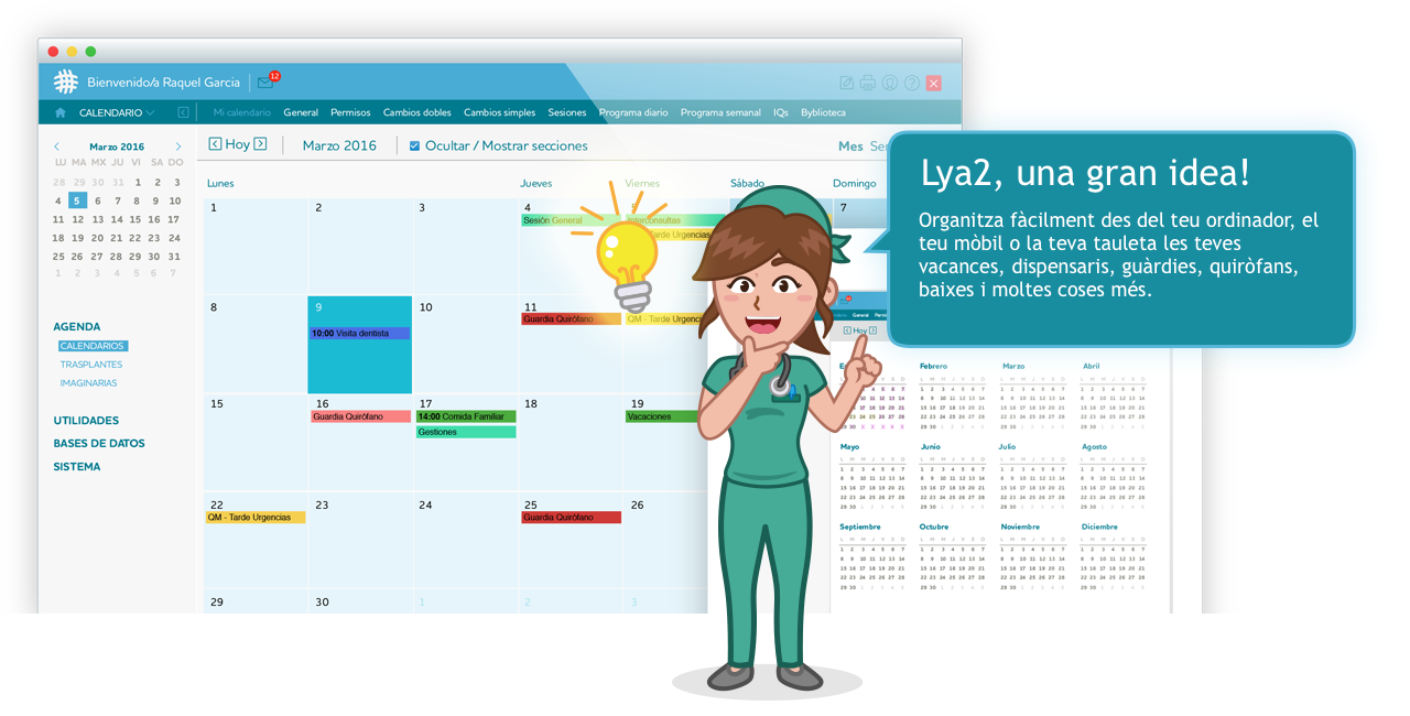 Estiguis on estiguis, amb tan sol un parell de clics, Lya2 et permet programar d'una forma ràpida, flexible i eficaç l'agenda diària, mensual o fins i tot anual de tots els membres del teu equip mèdic.